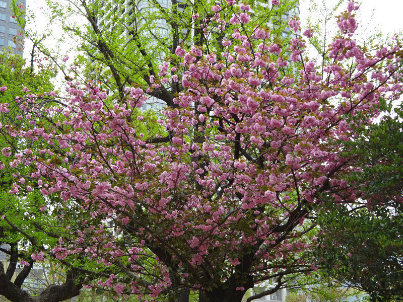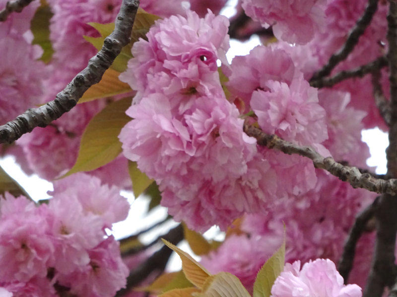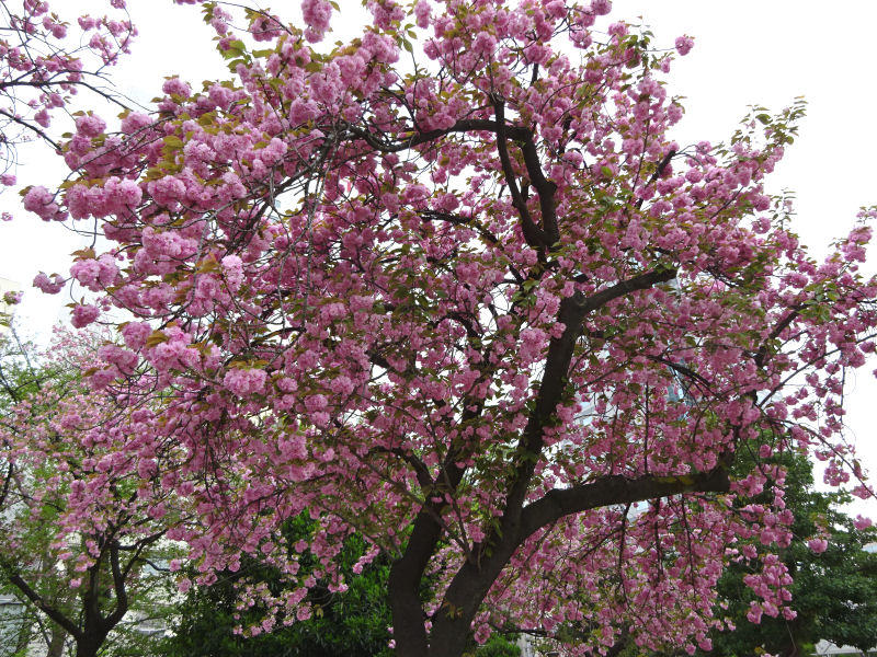 曇り空なのでパッとしませんが、八重桜のピンクが鮮やかです。回りが緑になってしまったので、余計に目立ちますね。