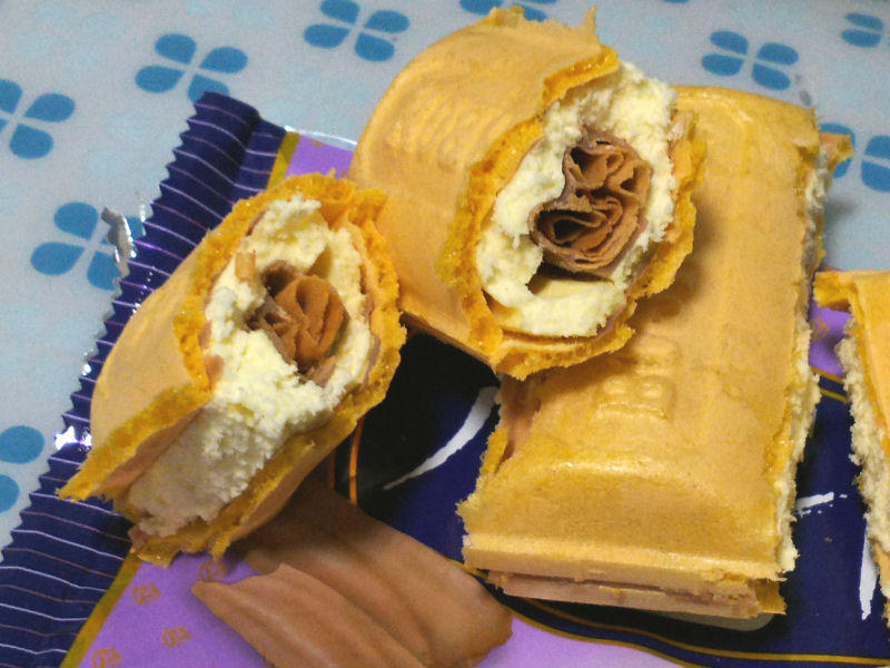 モナカを割ってみたところ。中からルマンドが登場しました。中のアイスはルマンドとの相性を考えられて作られていたアイスだそうです。