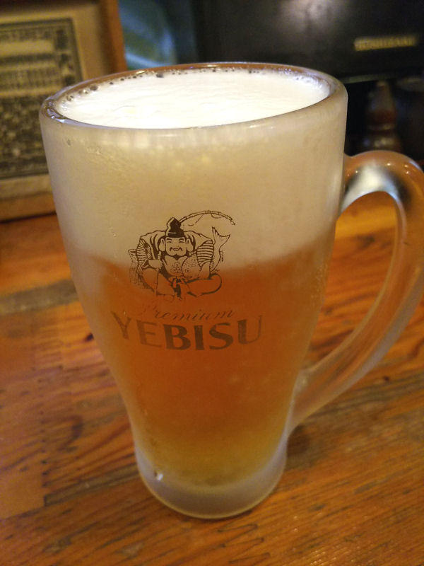 このお店はビールがヱビス!!。という事で中ジョッキでヱビスを一杯。日中は暑かったので、ようやくビールで一息つけました。