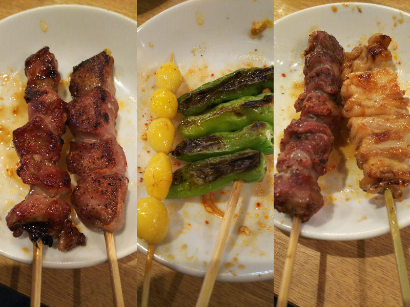 そして焼きとんなど串もの各種。安いので1人1本づつ。焼きとんはシロ、タン、カシラ、テッポーなど、焼き鳥は、砂肝。その他、ししとうに、ぎんなんと食べました~。もう少し食べたかったかも。