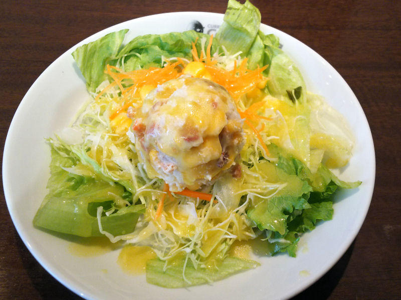 カレーといっしょに注文したサラダ。今回は、ベーコンとコーンのポテトサラダに。ドレッシングにもコーンの甘みがあって、これはなかなか面白い味付けでした。ベーコンとコーンの食感がいいアクセントになっているポテトサラダでした。