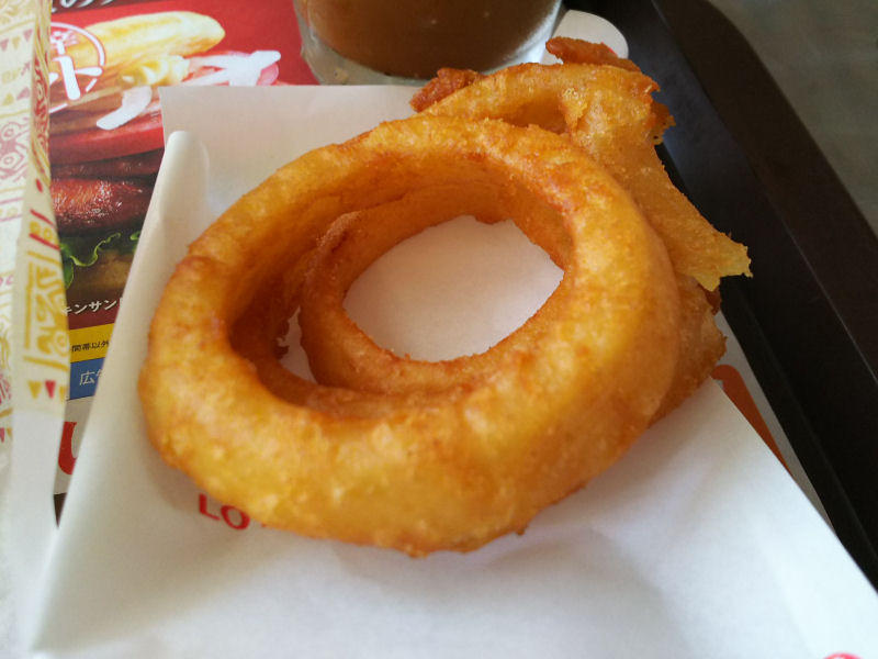 セットのオニオンリング。中々大きい。そして熱々。中の玉ねぎが柔らかくて中身だけ抜けてきてしまいますが、衣も美味しい。