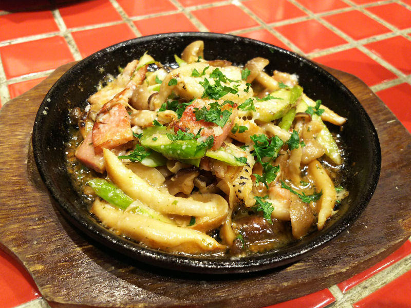 もう一品は、つぶ貝とアスパラのバタープランチャ。これは、初めて食べるなあという感じです。アヒージョっぽいけど、バターを使っているの風味がいい。アスパラとベーコンにきのこ類、これにつぶ貝が入ってるようです。これもおつまみとしてはいいですよ。