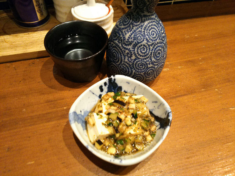 すでに一杯やってきたので、まずは日本酒。お通しは、山形だしがのった冷奴。これは、おつまみになるし、いい感じです。
