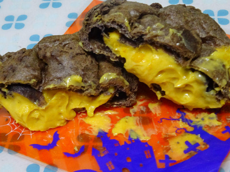 汚らしくなってしまいましたが、キャラメルパンプキンシューの中身です。思ったより緩めのクリームだったので、割った時に崩れてしまいましたね。かぼちゃのクリームがなめらかでいい食感に仕上がっています。