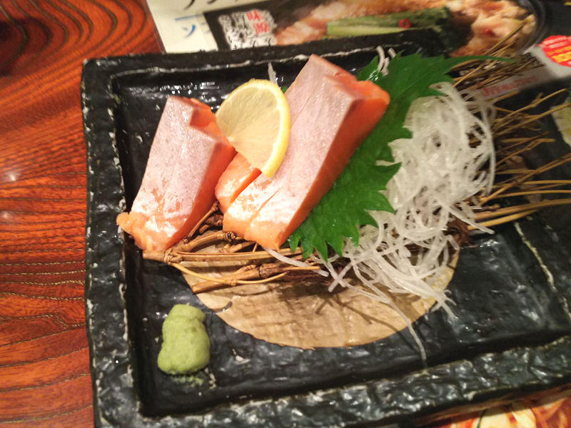 サーモンのお刺身。マグロよりサーモン美味しい。マグロの赤身も注文したけど、サーモンばっか食べてた。