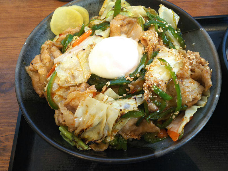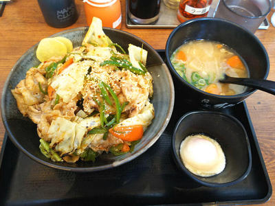 甘辛肉野菜丼は、温玉トッピングでいただきます。野菜たっぷりとはいったものの、肉もかなり多いのです。甘辛いタレが食欲をそそります。食べごたえはあるけど、野菜が多いのでそこまで肉々しくないのがいい感じです。通常のすた丼は生卵ですが、温玉なのがちょうどいい。