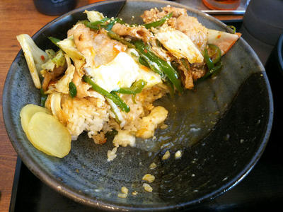 半分まで食べ進めたところ。野菜たっぷりですが、なにげにいいアクセントにあっているのが細切りのピーマン。これに味が染みてて、食べやすさが増してます。野菜も多いせいか、いつもよりもご飯が少なく見えるのは気のせいでしょう。以前はよくたべていたピーカラ丼。気がついたら4年ぶりくらいに食べた事が発覚。そんなに食べてなかったのね。