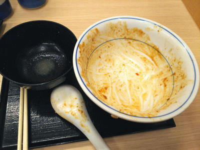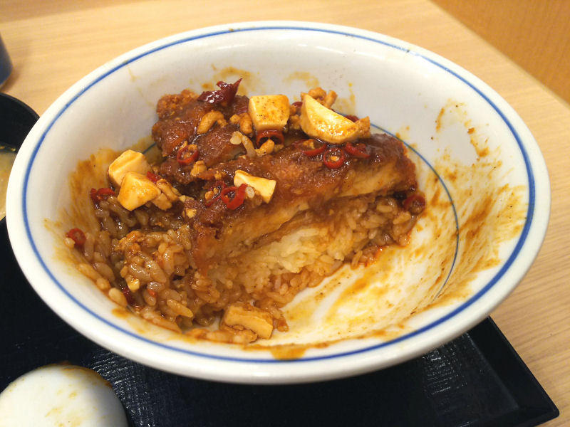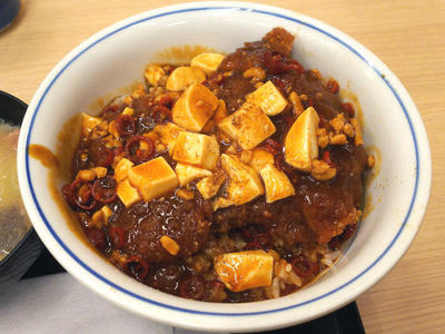 そして、麻婆チキンカツ丼。まあ、まんまチキンカツに麻婆豆腐がかかっているわけですが。見ての通り唐辛子もたっぷりはいっててかなり辛目になっています。麻婆にチキンカツって合うのかと思いましたが、あの味付けだと案外なんでも合ってしまうものだなぁと思いました。こうなると、麻婆ダレチキンカツでいい気もしてくるので、豆腐いるのかという話になりますが。