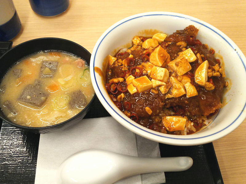 という事で、麻婆チキンカツ丼に豚汁(小)。かつやの豚汁は具だくさん。小サイズでも食べごたえがある。