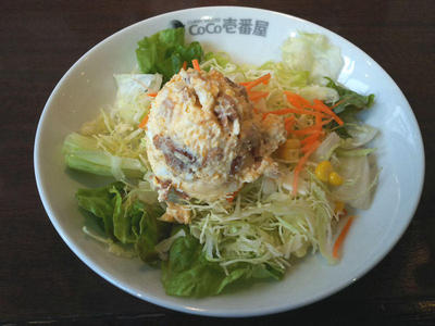 まずは、サイドメニューのサラダから。てりチキタマゴサラダを食べてみる事にしました。タマゴサラダに、テリヤキチキンが混ぜ込まれているという、なんだか凄いサラダです。照り焼きの甘みと玉子がこれまた凄く合う。柔らかいキチンと、タマゴサラダも程よい食感のアクセントが絶妙です。ココイチのサラダは、侮れない。