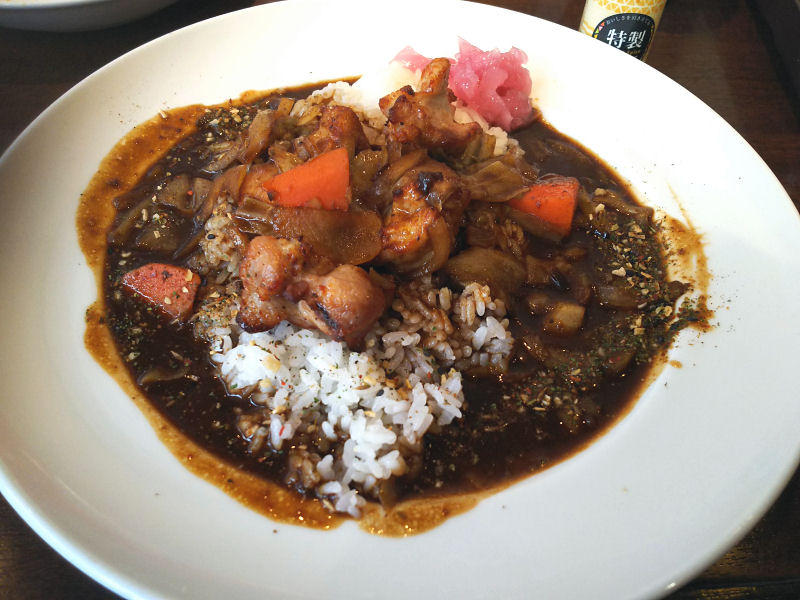 トッピングのローストチキンは、程よくローストされていて、すごく柔らかくて食べやすい。スパイシーなカレーとも相性はいいですね。ローストチキンがあるせいか、カレーの具には肉がないので、ローストチキンとカレーは一緒に食べた方がよさそうです。