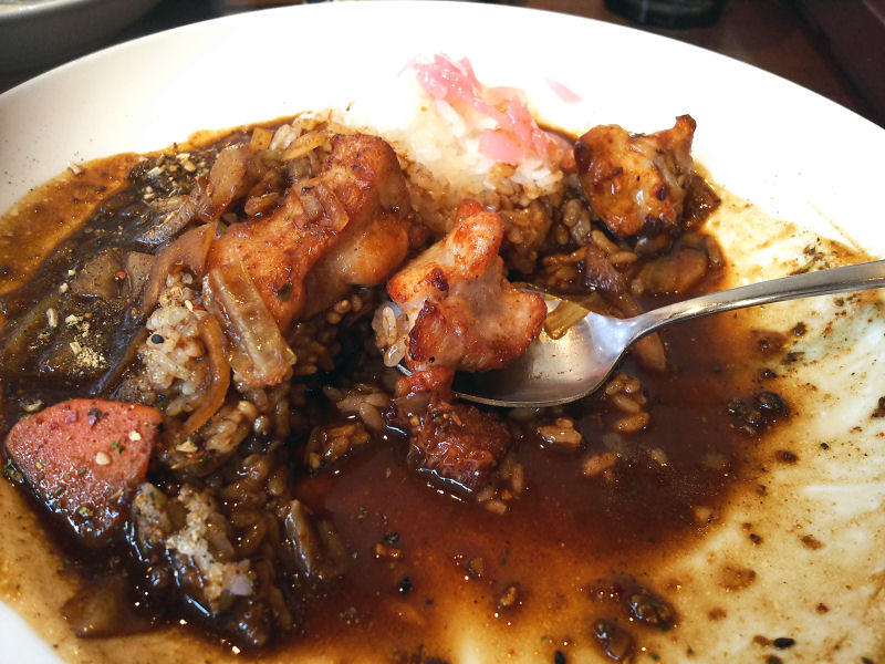 そして、「大人のスパイシーカレー THE ローストチキン」。真ん中にご飯がもられていてその両脇にカレーがいるスタイル。トッピングのローストチキンが美味しそう。添え物にある謎の赤いやつ。甘酸っぱい感じで、何かと思ってましたが、ピクルスのようです。この辛さが引き立つカレーに、ピクルスの甘みが意外と合う。