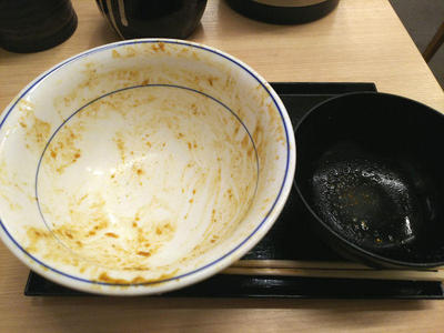 チキンカレーかつ丼、完食しました。ごちそうさまでした。最初、かなりアツアツで食べるのに苦労しましたが、だんだん慣れてきました。