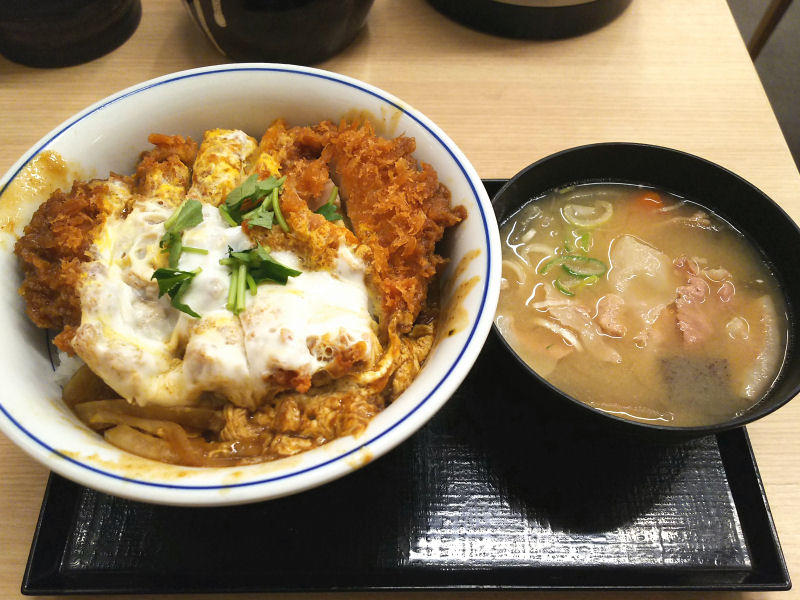 という事で、チキンカレーかつ丼と豚汁小です。さて、チキンカレーかつ丼ですが、これは通常のかつ丼ダレに代わってカレーで玉子とじにしたかつ丼のようです。