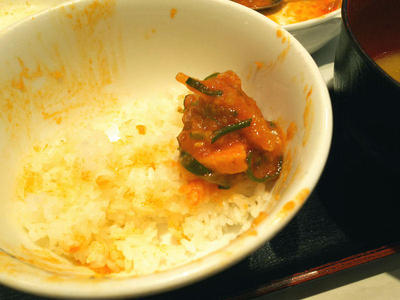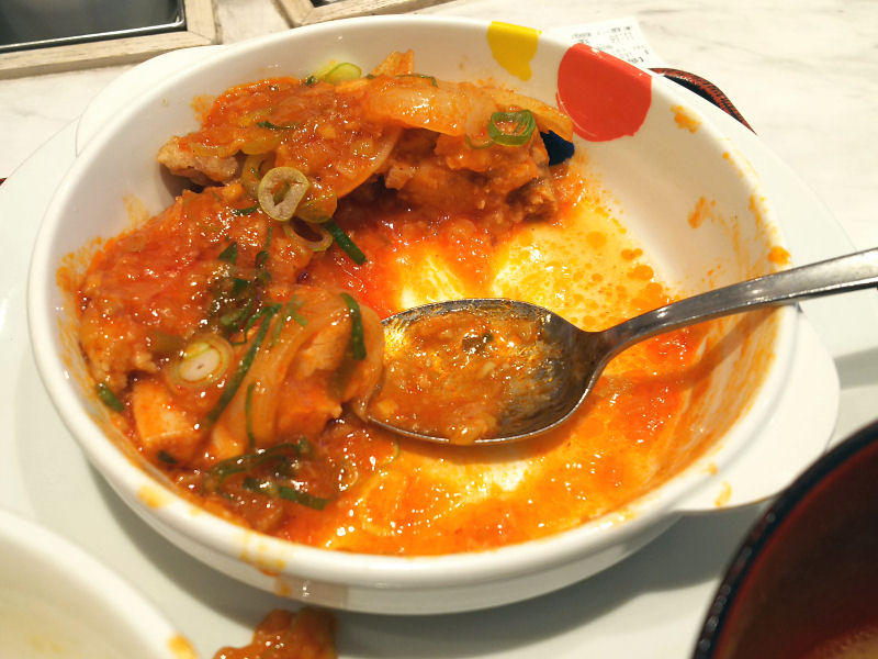 この濃厚チリソースとチキン。ご飯にオンして食べるのがいい。しかし、このチキン。かなり大ぶりなので、最後の方になると結構噛み疲れてきますよ。でも、うまい。