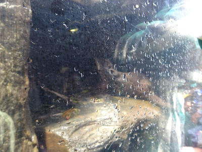 ここでの展示のとは直接関係ないんですが、ユーラシアカワウソの展示がされています。しかし、このカワウソたち、全然姿が見えない。どうやら、裏のところで休んでいるようでした。一匹だけ活発に動いていた他ははここで寝てました。水しぶきや、ガラスの反射の関係でなかなか写真が取りづらいのが難点ですが。もう少し、カワウソたちが遊んでるところが見たかった気もします。