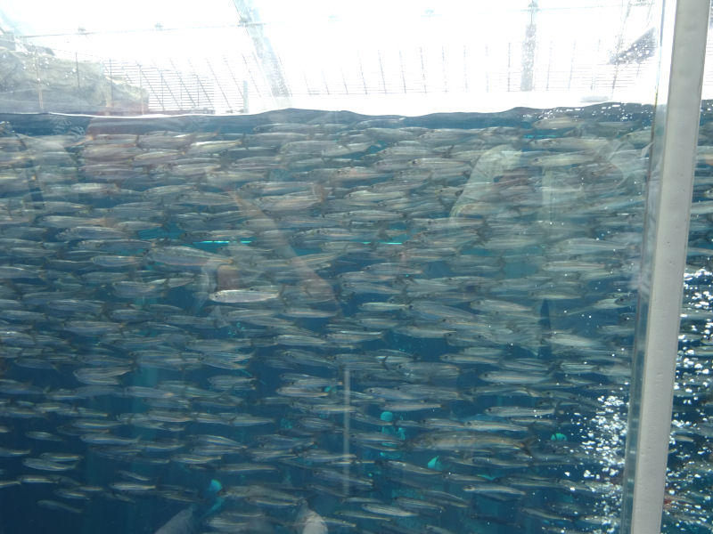上の階に登ってまず目についたのが、潮目の海の魚の大群。海流にのって進むイワシの群れです。これ、どういうふうに動きてるのかわからないのですが、ずっと泳ぎ続けているんですよね。