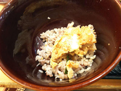 四元豚ロースかつの玉子とじ。いわゆるカツ煮なんですが、お肉がかなり肉厚で大きめなので、カツ煮にしてもボリューム感がたっぷりでした。ほぼ、土鍋一杯のとんかつですからね。大きいので、まだ表面のサクサク感が残っているのもいいです。玉子の他に玉ねぎ、ニラが入っていて、スタミナ感たっぷりでもあります。