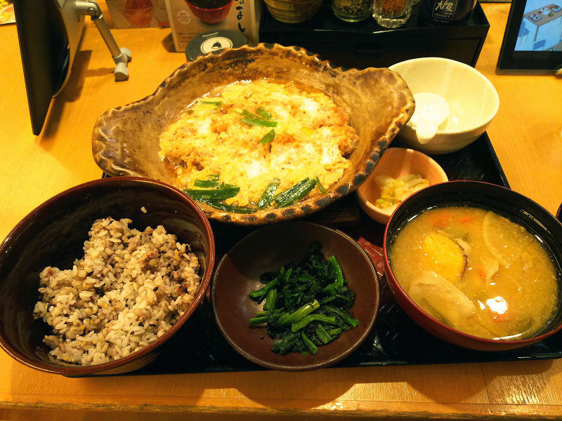 四元豚ロースかつの玉子とじ定食。ご飯を五穀米のちょっと大盛り、さつまいもの豚汁。ほうれん草の胡麻和えを付けました。