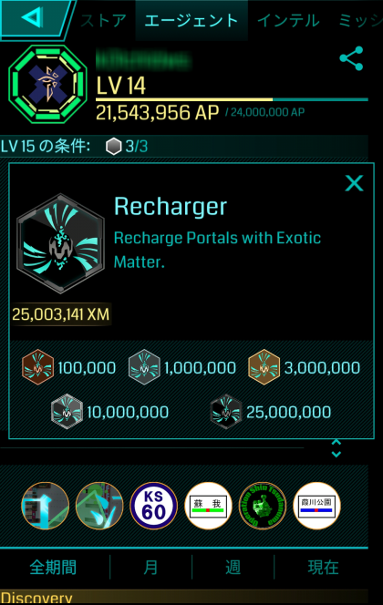 Rechargerメダルは、外出しなくても、地道にリチャージしていけばゲット出来るので、比較的達成しやすいメダルではあります。ただ、パワーキューブが枯渇してくると、しばらくリチャージ出来なかったりして、さすがに時間がかかりました。