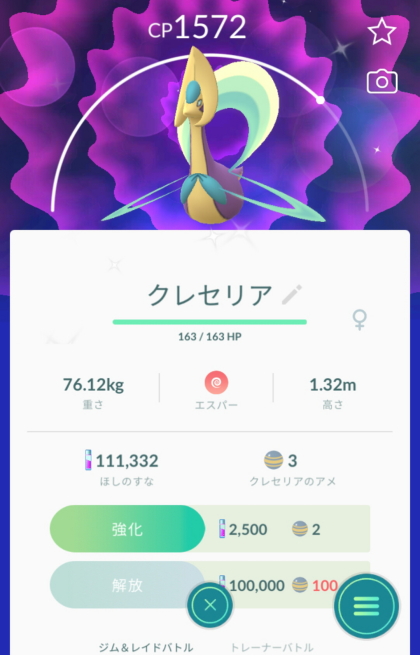 今回は、レイドバトルでクレセリアをゲットした後にレベルアップしました。クレセリアは初ゲットです。