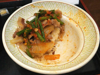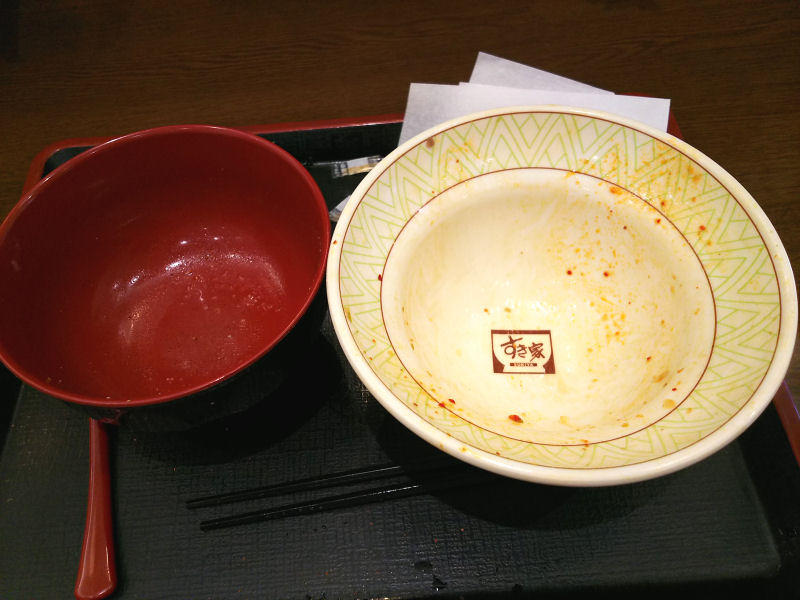 半分まで食べたところ。中盛りなので、ご飯は普通盛り。具が多いとなんか嬉しい。すき家の中盛って去年くらいから始まったんだけど、前からやればよかったのに。吉牛で言うところの頭の大盛りですが、もしかしたら出来たのかな!?
