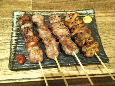 そして、やきとん。右からしろ、たん、かしら、はらみだったと思います。1人で食べるなら、これくらいの量が丁度いいですね。焼きたて熱々の串焼きはやっぱりうまい。