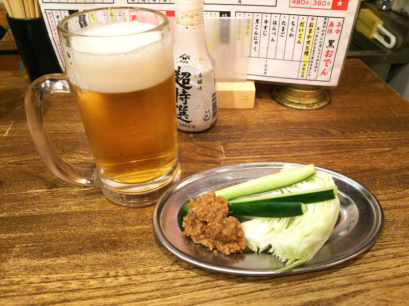 まずはビールから一杯やります。お通しはいつものキャベツときゅうりに肉味噌がついてきます。これだけでも、いいおつまみになります。