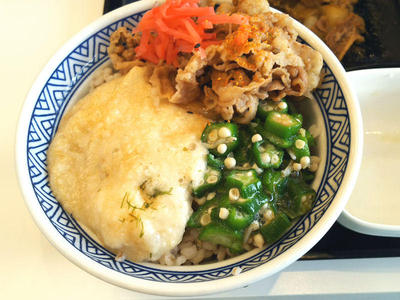 オクラ、とろろ、牛肉で三色丼風にしていただきます。牛肉は量が多くて乗り切らなかった。ご飯大盛りなのに、完全に乗せる具が多すぎて余ってしまうというのがすごい。