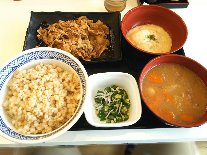 吉野家の夏メニュー「牛皿麦とろ御膳」。今回はご飯大盛りにしました。さらに、豚汁変更。麦ごはんの麦がいっぱいでヘルシーな感じです。