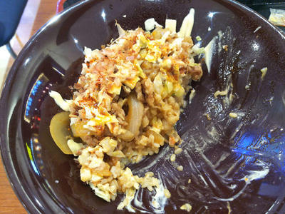 お好み牛玉丼、残り半分。牛丼の汁っけが多めだったのとマヨで、かなりマヨネーズご飯ぽくなってしまってますが、いちおう牛肉もまだ残っています。マヨラーなら、間違いなく美味しいのでしょうね。後で気づきましたが、紅生姜もあった方が良かったかなと。