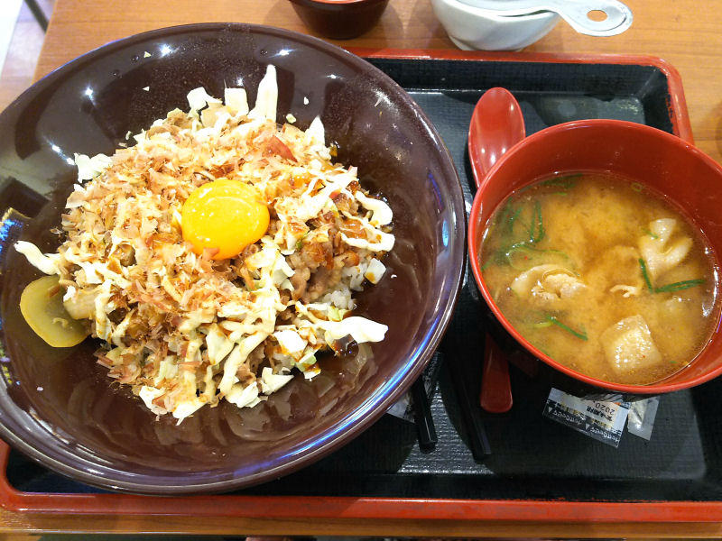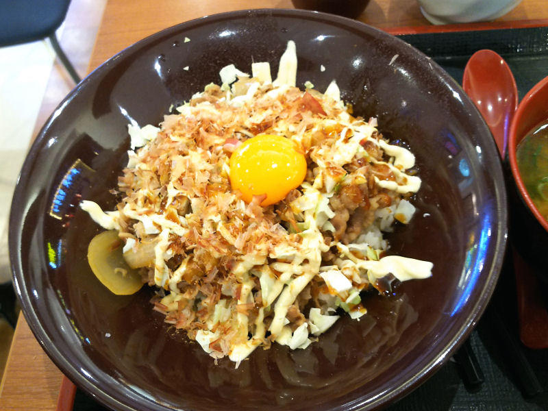 お好み牛玉丼。いつもの牛丼の上に、キャベツをトッピング。オタフクソースとマヨネーズ、おかかに玉子の黄身をのせて完成。