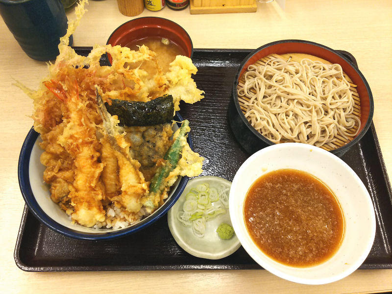今回は、夏メニューの穴子とめごちの天丼にしました。おろしそばもセットにしました。