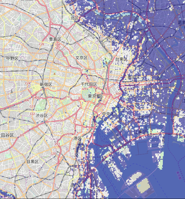 "世界を変えてしまった"というには大げさ過ぎますが、東京に関して言えば大きく地形を変えてしまった事になります。水没マップで東京近辺を7m沈めるとこんな感じなのですが、意外と山手線ないは陸地が残ってます。むしろ江戸川区あたりが完全に沈んでるんですが。