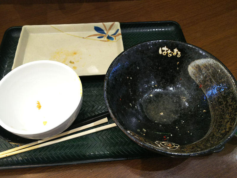 ライス小を後で食べきると結構多い感じがします。はなまるうどんのうどん中はそもそも多めなんですよね。食べ終わったらかなりお腹膨れました。