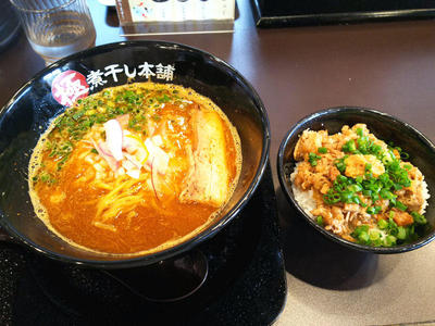 ちょうど、お昼時だったので混み合ってました。ランチメニューで、辛煮干し豚骨ラーメンと山わさびチャーシュー丼のセットをたべてきました。