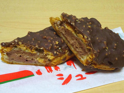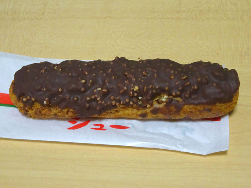 続いて、小枝シュー。ご存知、森永の小枝とのコラボシューになります。まんま、見た目小枝を大きくしたようなシュークリームです。どちらかというと、エクレアっぽい感じです。
