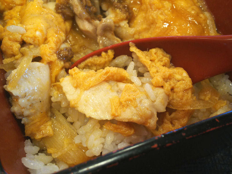 名古屋コーチンの親子重。半分まで食べてみました。さすがに名古屋コーチンは美味しいです。これ、お箸で食べるよりスプーンの方が格段に食べやすい。ご飯の汁っけがあるせいもありますが、お重だとなおさら食べやすい。