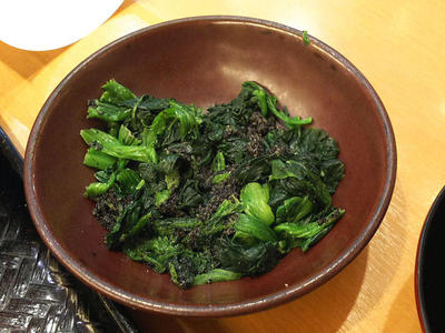 ほうれん草のごま和え。大戸屋のごま和えは黒ごまを使っているので、こんな色合いなのです。ほうれん草のお浸しか、このごま和えのどちらかを付けるパターンが多いです。