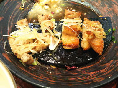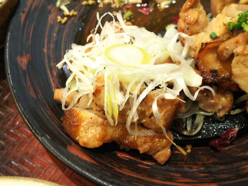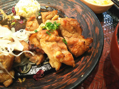 もろみチキンの炭火焼きは、このくらいの量。炭火で焼いてるので香ばしさがありますね。もろみチキンですが、あっさりとした味付けという感じです。