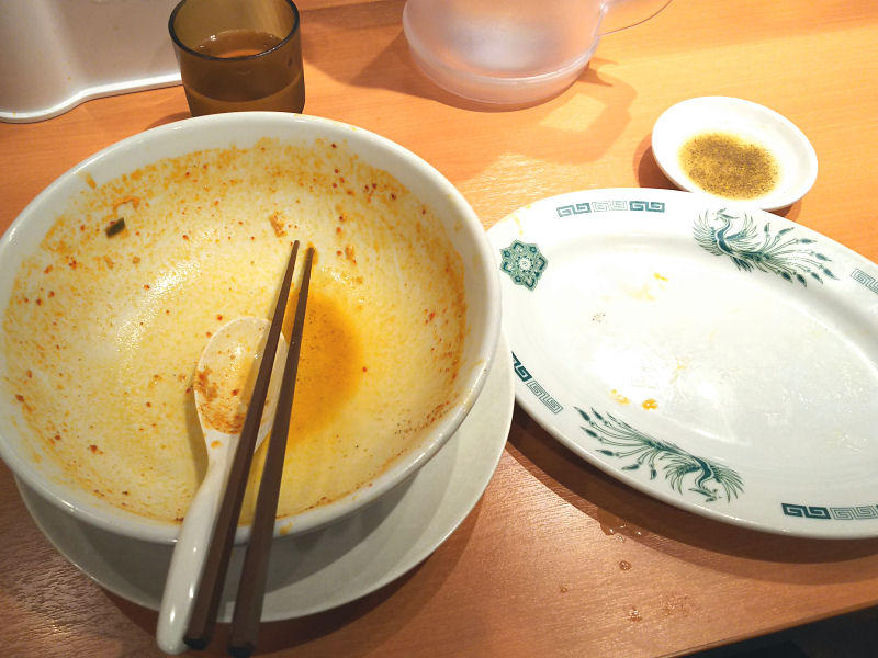 チゲ味噌ラーメン、今年日高屋で出していた大宮担々麺と似た感じなので、おそらくスープを残してご飯を入れて食べても美味しいんだろうなという気がします。今回は餃子セットなので、やめときましたが、今度試してみようかなと思ってます。