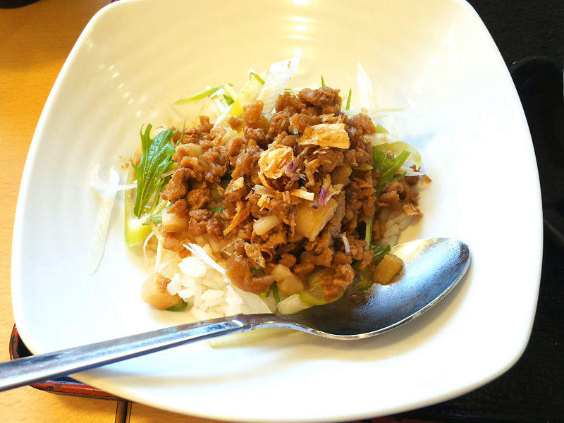 ミニ台湾風肉丼。まあ、おそらく、担々麺にのっている肉で作った丼という感じですね。これは、普通に美味しかったです。