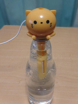 中身はこんな感じです。これは猫になってますが、何種類かあったと思います。あまり深く考えずにペットボトルにさしたら、割となみなみといれないといけないようです。どうやら、小さめのペットボトルに入れて使うのが正解だったらしく500mlだと、ちょっと大きすぎるようです。