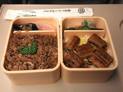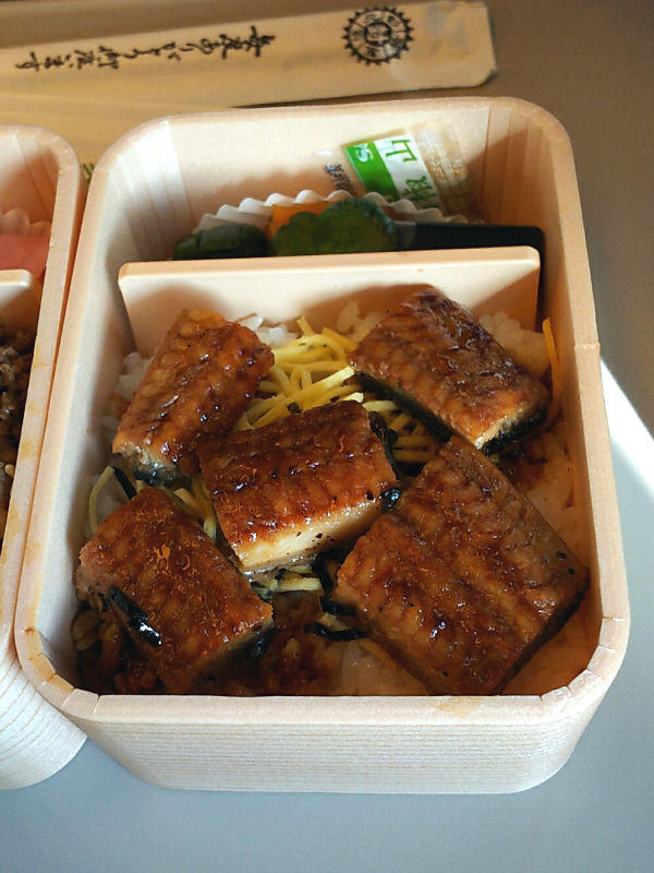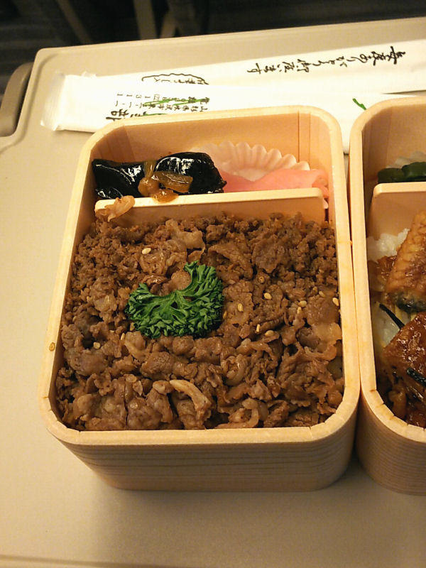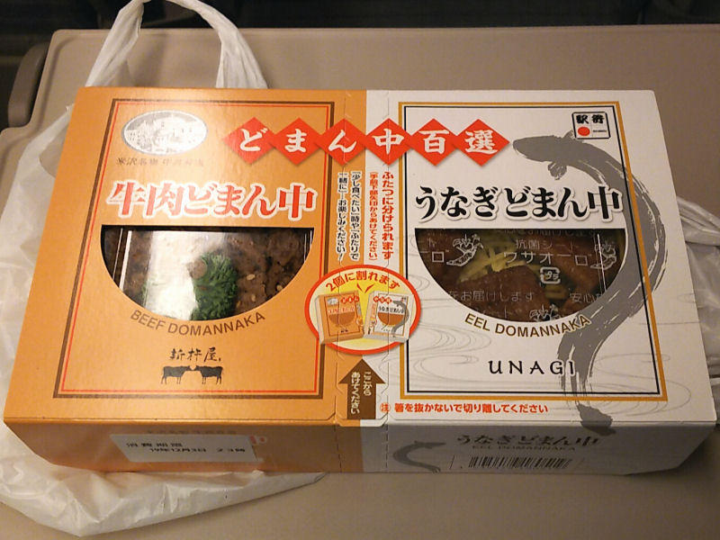 お昼ご飯は、東京駅で買ったお弁当にしました。牛肉どまん中とうなぎどまん中がセットになったどまん中百選のお弁当にしました。牛肉どまん中は、これまでも食べた事がありましたが、うなぎや海鮮のどまん中もあったのですね。異なるお弁当が2つセットになっているというだけでもお得感があります。