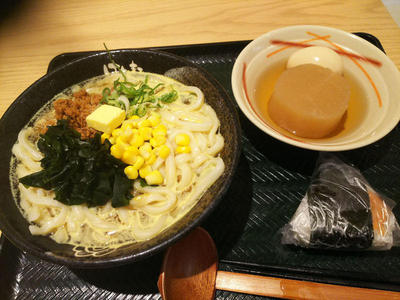 という事で、味噌カレー牛乳うどんに、おでん、明太子おにぎりをつけました。最寄りの津田沼店だとおでんおいてないんですが、はなまるうどんはおでんがあるという噂は聞いていたのですが、見かけるのは初めてでした。