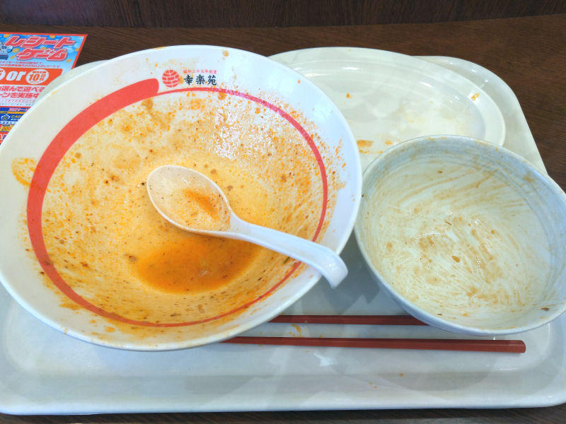 途中から、汗がじわじわと出てくる感じでした。なんだかんだで完食。これは、結構お腹膨れました。ラーメンとご飯だとキツイ歳なんですかね。機会があったら、ライスセットでもう1回食べてみたいです。