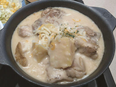 シュクメルリ鍋。にんにくがたっぷりときいたホワイトソースにチーズがたっぷりと入ってます。焼き目のついたチキンに、さつまいもが数個はいっている感じになっています。とろりとしたソースで、これ自体でもご飯食べれる感じになってます。