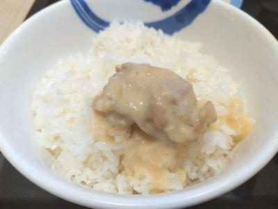 とりあえず、食べ方がよくわかりませんが、普通にご飯にチキンをのせて食べてみました。たしかに、にんにくの風味はしますね。まあ、雰囲気的には、ご飯にホワイトシチューかけて食べてるような感じの違和感がありますが、これでいいんでしょう。個人的には、ご飯物にするなら味付けが少し薄いかなという気もしました。