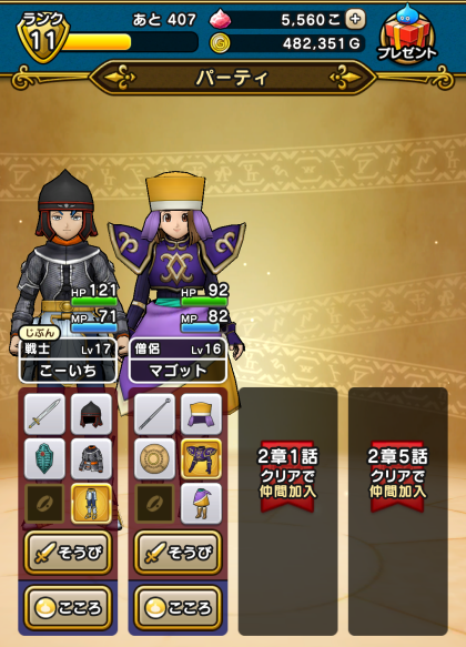 第1章コンプリート時点でのレベル。じぶんがLV17、僧侶がLV16まで来ています。推奨レベルを遥かに越えてるのでそりゃ難なくクリア出来るはずですわ。